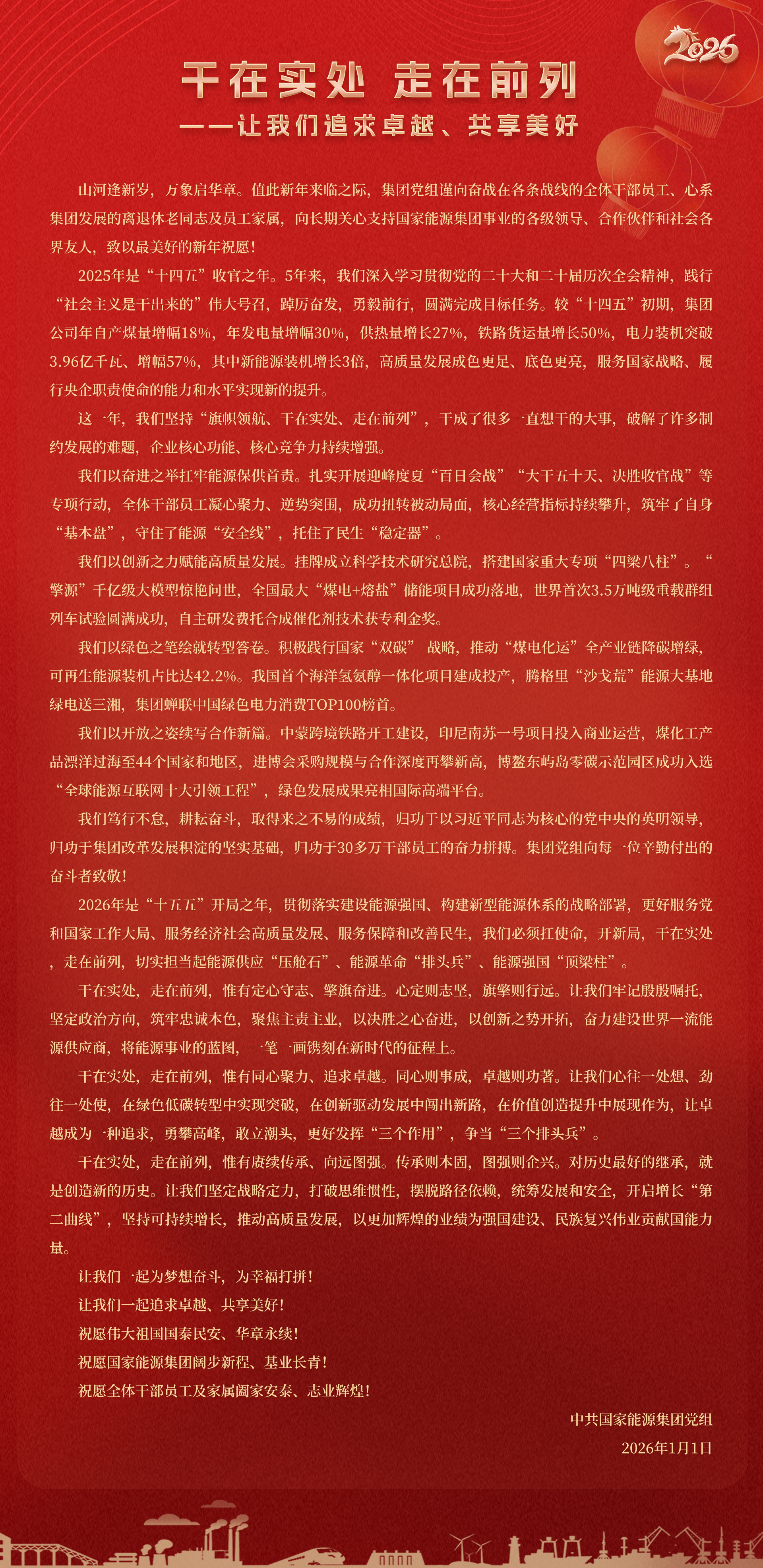 國家能源集團胸懷“國之大者”,增產(chǎn)增供、穩(wěn)價穩(wěn)市,積極服從服務(wù)國家戰(zhàn)略、保障國家能源安全、助力國民經(jīng)濟穩(wěn)增長,推動煤炭安全綠色智能、煤電清潔高效穩(wěn)定、現(xiàn)代煤化工高端多元低碳、運輸物流協(xié)同一體、新能源多元創(chuàng)新規(guī)模化發(fā)展,全力擔(dān)當(dāng)能源強國頂梁柱,能源供應(yīng)壓艙石,能源革命排頭兵。
